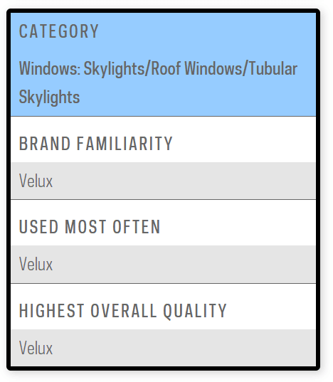 VELUX ranked #1 in all three categories, and this can be seen in other brand use studies across the board in the past ten years.